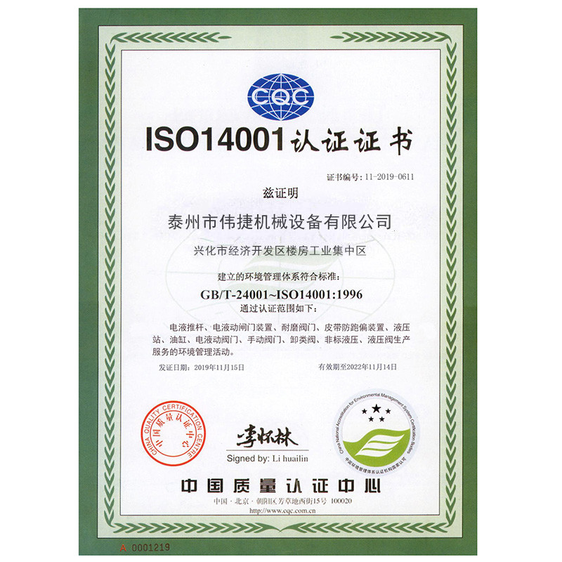 Weijie Machinery Equipment Qualification Certificate
